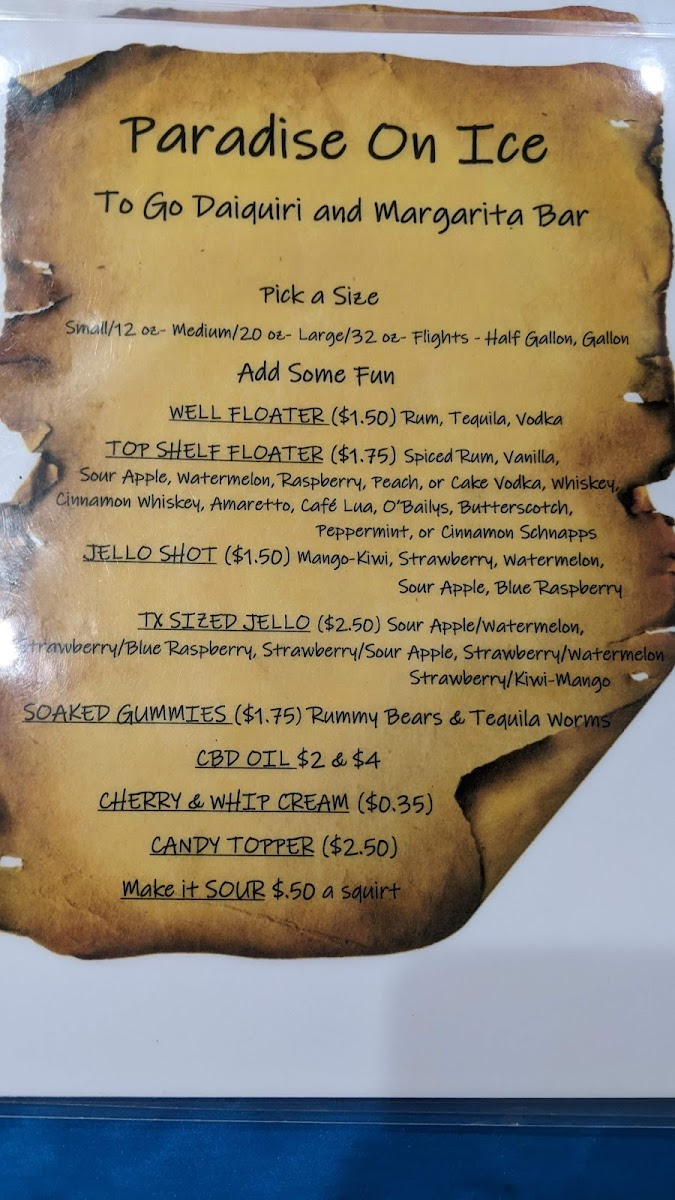 Welcome to Paradise On Ice Daiquiris, your go-to spot for delectable frozen concoctions in Pflugerville, TX. Located at 1700 Grand Ave Parkway, this vibrant bar elevates your drinking experience with an enticing menu full of flavors. Customers rave about the incredible selection, from refreshing classics to unique blends, ensuring there's something for everyone.